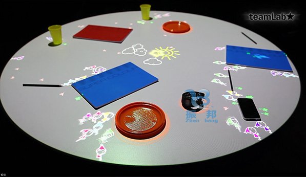 投影在桌面,參與者與桌面內(nèi)容進(jìn)行互動,主要展現(xiàn)一些益智類型小游戲等。